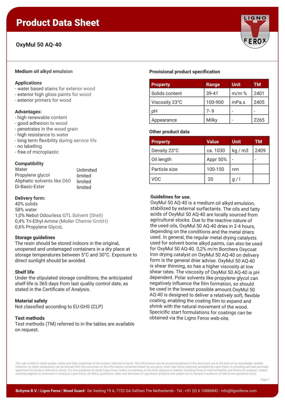 Ligno Ferox heeft enkele start formuleringen voor coatings ontwikkeld, en grondstoffen getest op bruikbaarheid in coating formuleringen op basis van de OxyMul 50 AQ-40. Op de Ligno Ferox website zijn zowel het Product Data Sheet van de OxyMul 50 AQ-40, als enkele startformuleringen voor coatings te vinden.